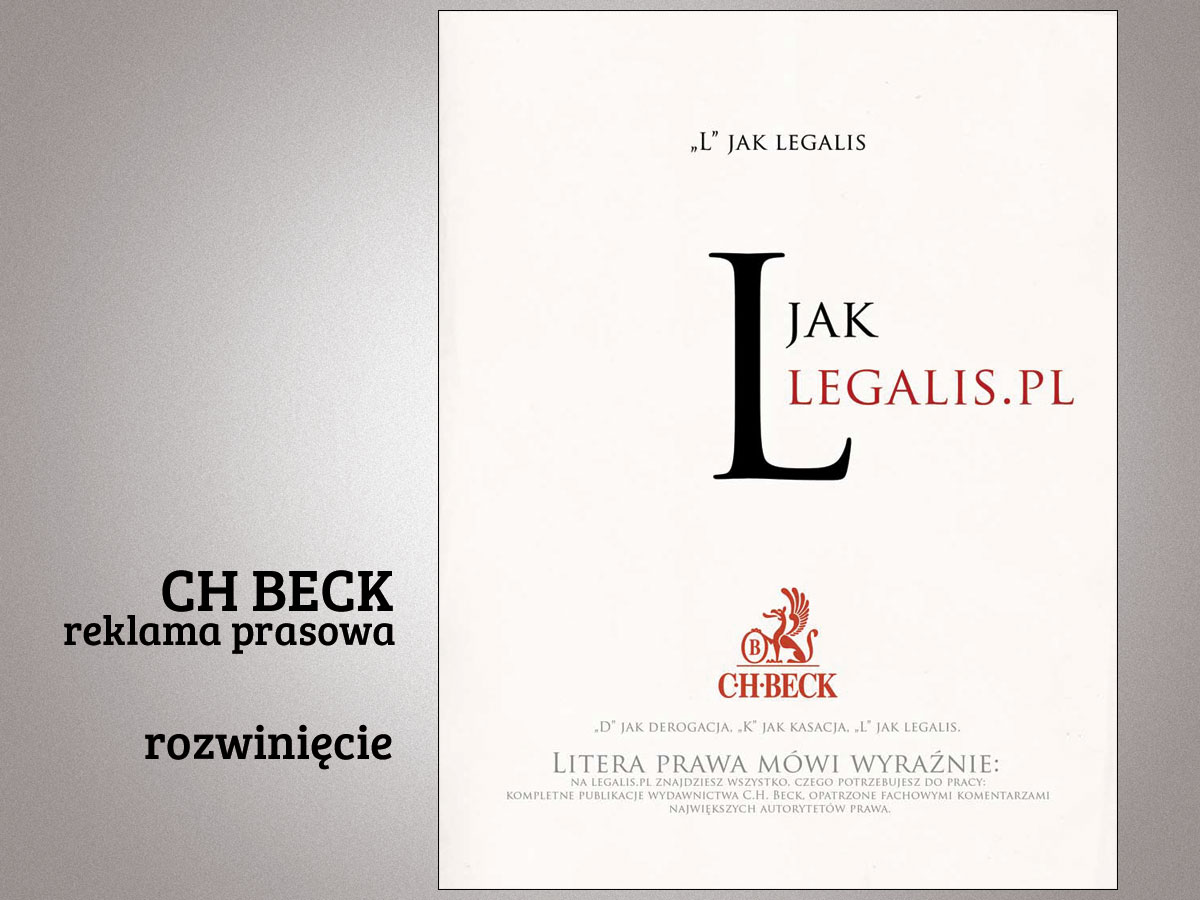 Dla wydawnictwa prawniczego C.H. Beck przygotowaliśmy reklamę encyklopedycznego systemu Legalis, opartą na jednym motywie znanym z klasycznych encyklopedii: litery, słowa i wyjaśnienia.